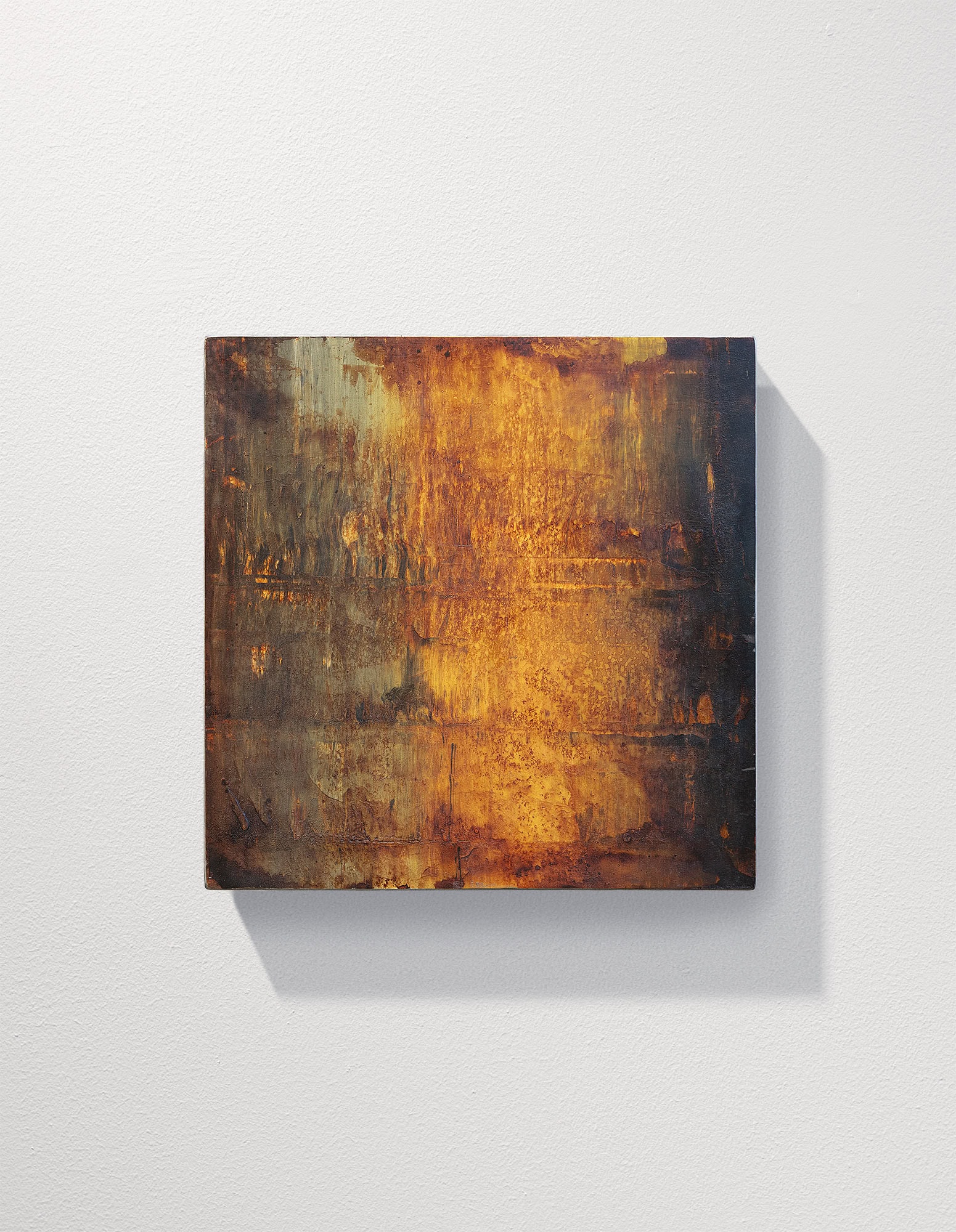 These works are created using mixed media, acrylic and ink on oxidized sheet metal. The frames below are handmade look like a box with 30mm depth and have spacers from wall to create a more sculptural feel. The iron frame is naturally lead gray.
